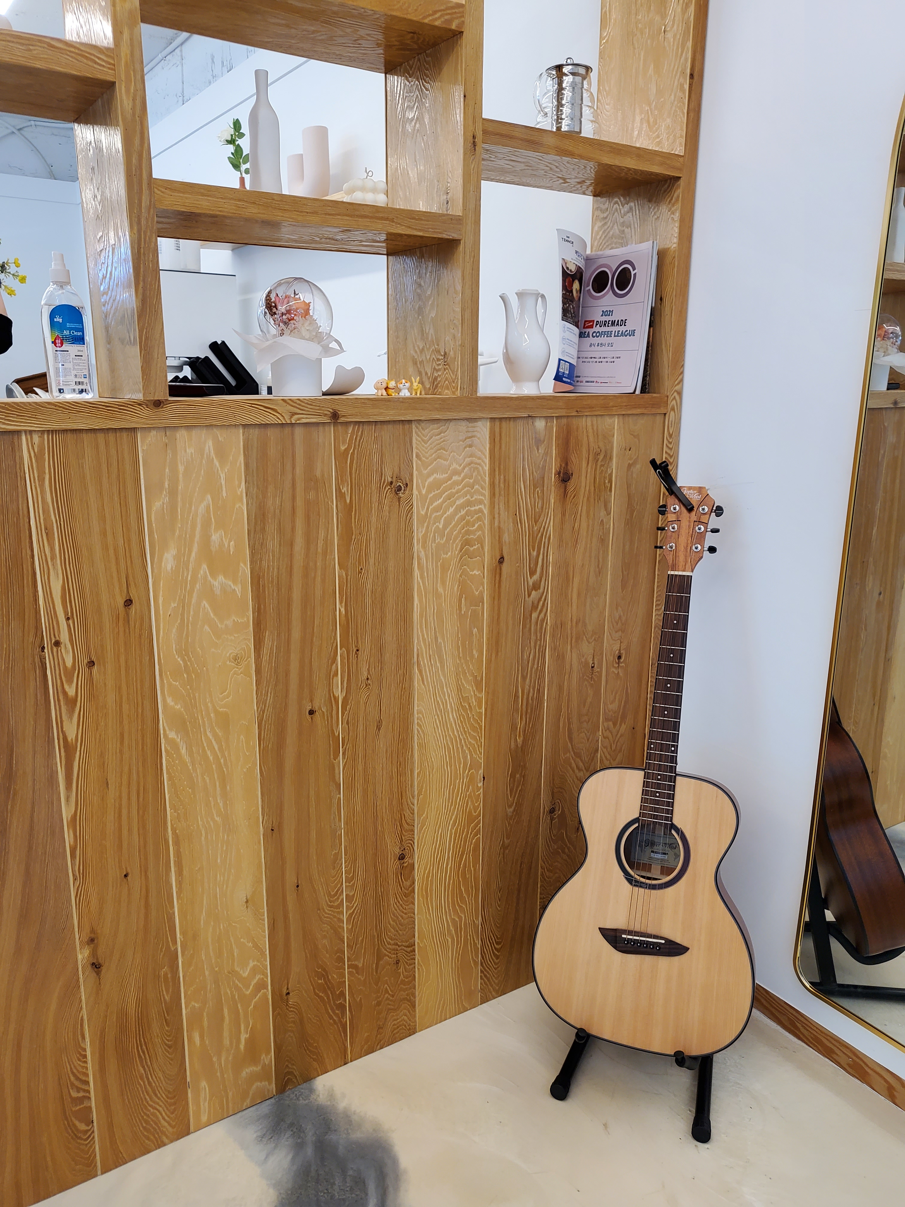 거울 양옆에 기타와 화분 인테리어가 잘되어있네요~