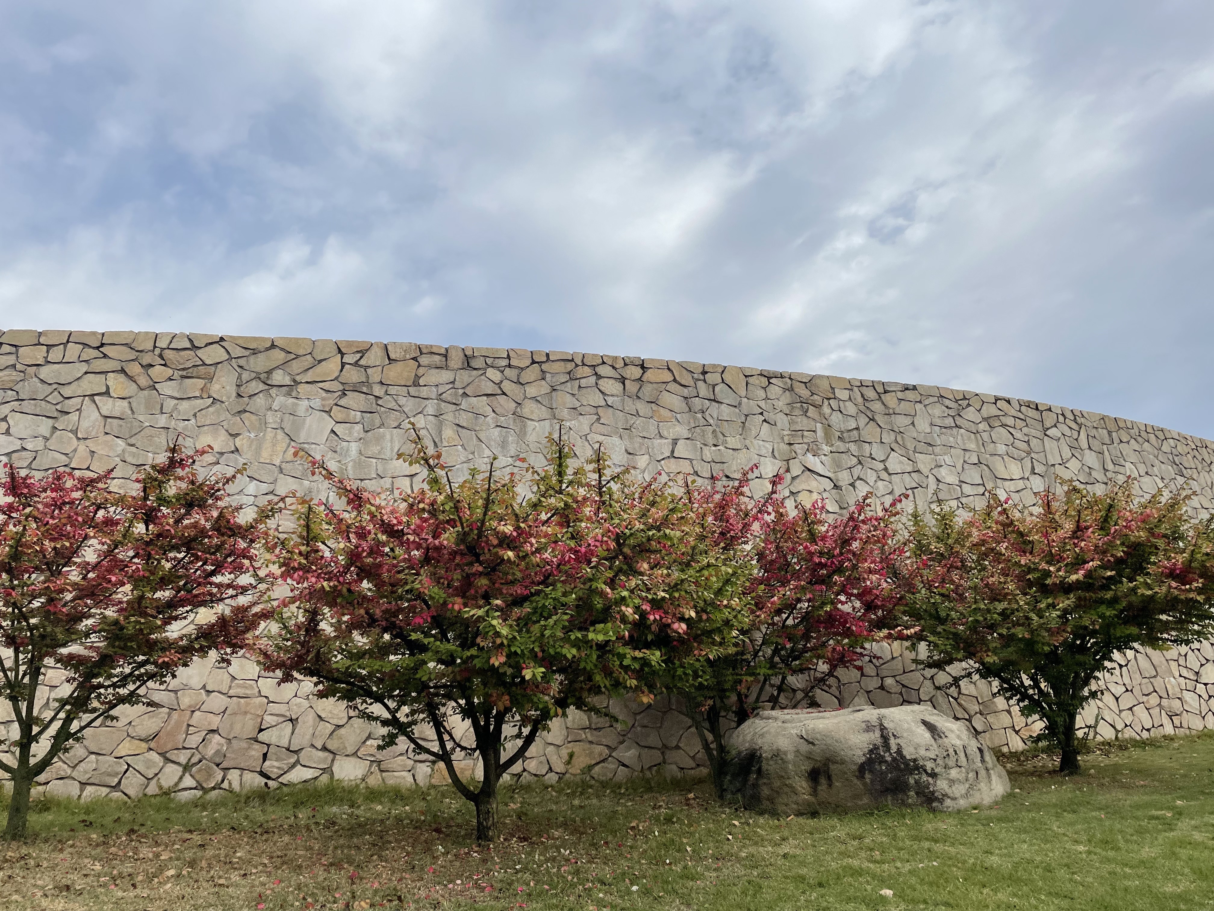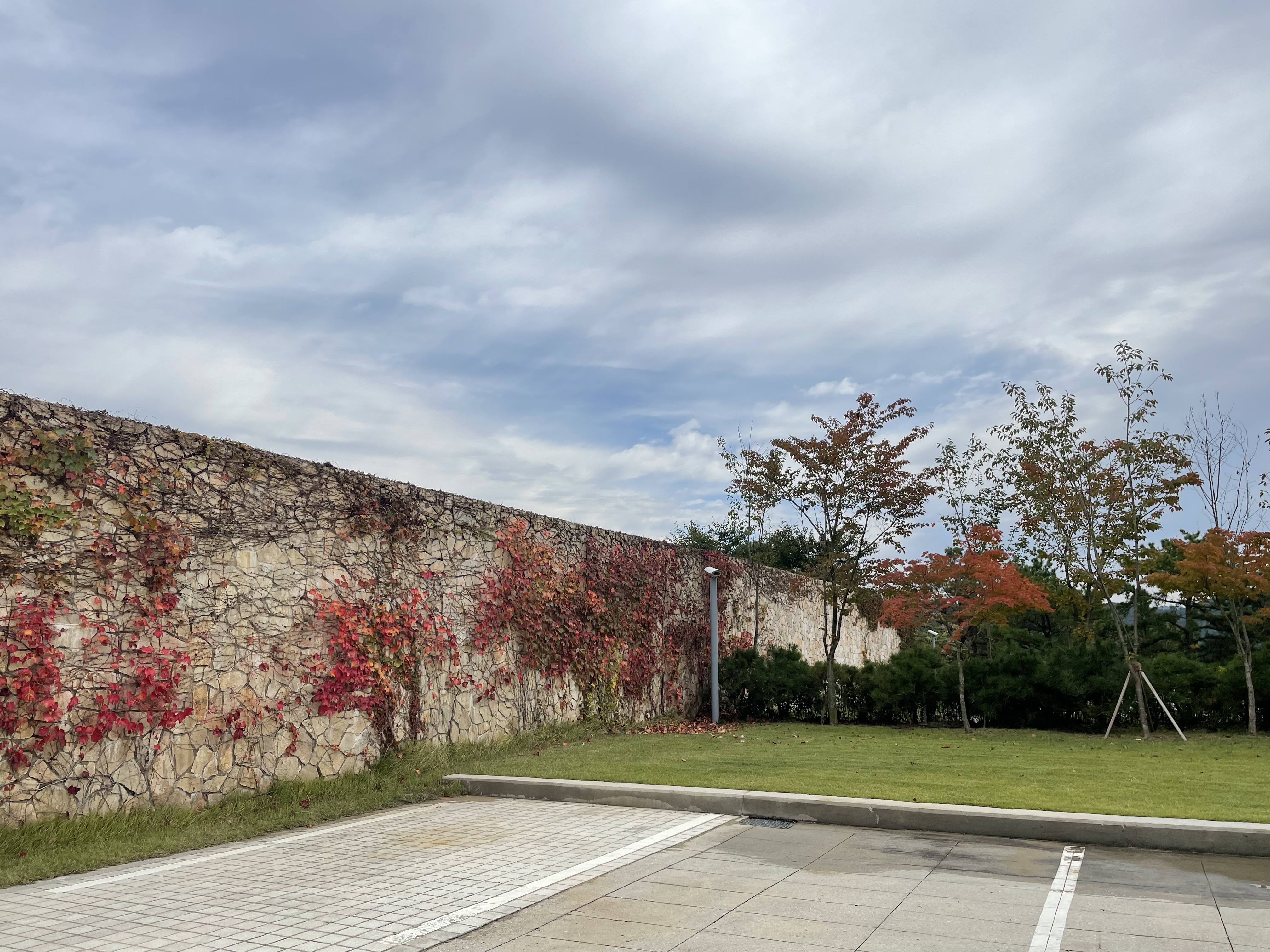 담벼락에 있는 식물이 붉게 물들어